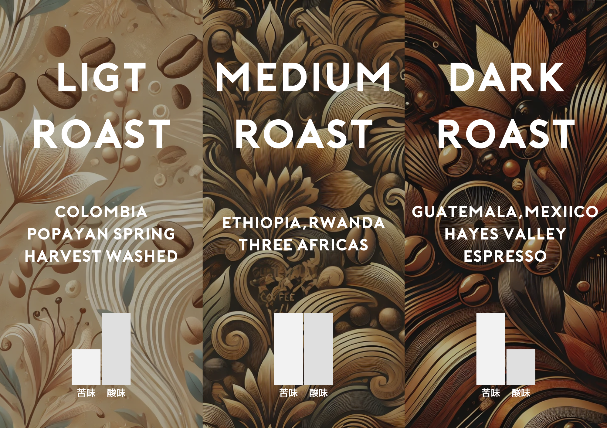 コーヒを使ったメニューは、酸味が強くフルーティーな風味を味わえる浅煎りの豆、酸味と苦味が抑えめで飲みやすい中煎りの豆、酸味が弱く濃厚で深いコクが味わえる深煎りの豆の三種類の中からお好きのものをお選びいただけます。